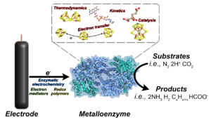 The Milton group performs research in the domain of bioinorganic chemistry. Specifically, we are interested in metal-containing enzymes that can be utilized in new biotechnologies for improved environmental sustainability. We study complex metalloenzymes that transfer electrons to carry out reactions such as (i) nitrogen reduction to ammonia (for agricultural and chemical industries), (ii) proton reduction to hydrogen (a promising fuel) and (iii) carbon dioxide reduction (to convert CO2 to fuels). In order to study mechanisms, we employ electrodes to artificially supply electrons to metalloenzymes.
